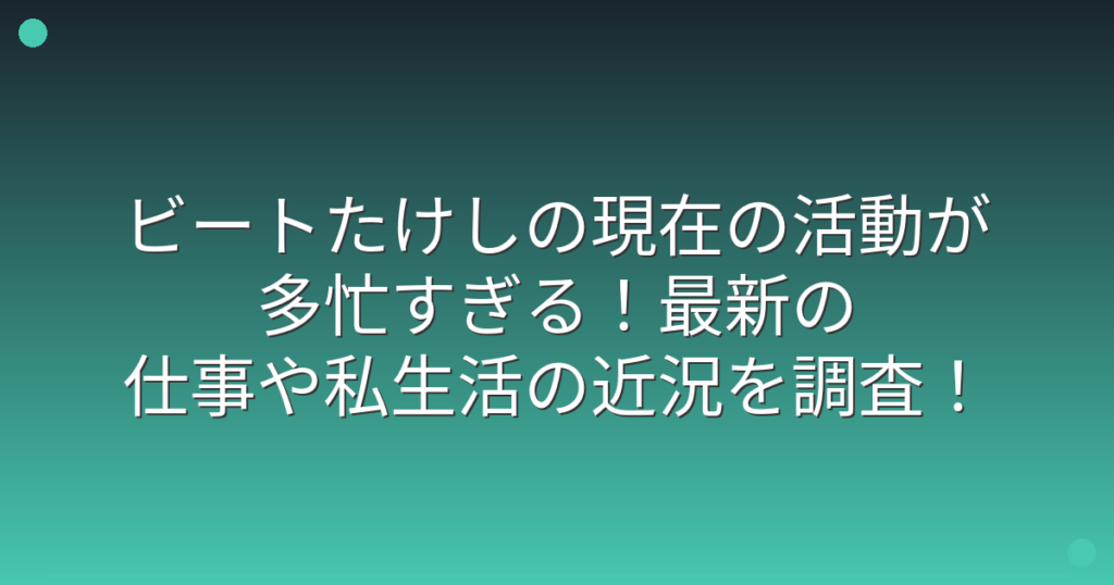 ビートたけしさんの現在の活動が話題になっていますね。 お笑い界の巨匠として長年活躍し続けているたけしさんですが、最近の仕事や私生活はどのような状況なのでしょうか。 そこで今回は、ビートたけしさんの現在の活動状況や最新の近況について詳しく見... -