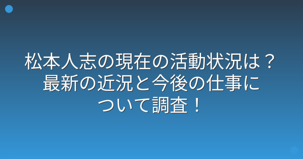 お笑い界の巨匠として長年活躍してきた松本人志さんですが、現在の活動状況が気になっている方も多いのではないでしょうか。 テレビで見かける機会が変わってきたこともあり、最新の近況や今後の仕事について注目が集まっています。 そこで今回は、松本人... -