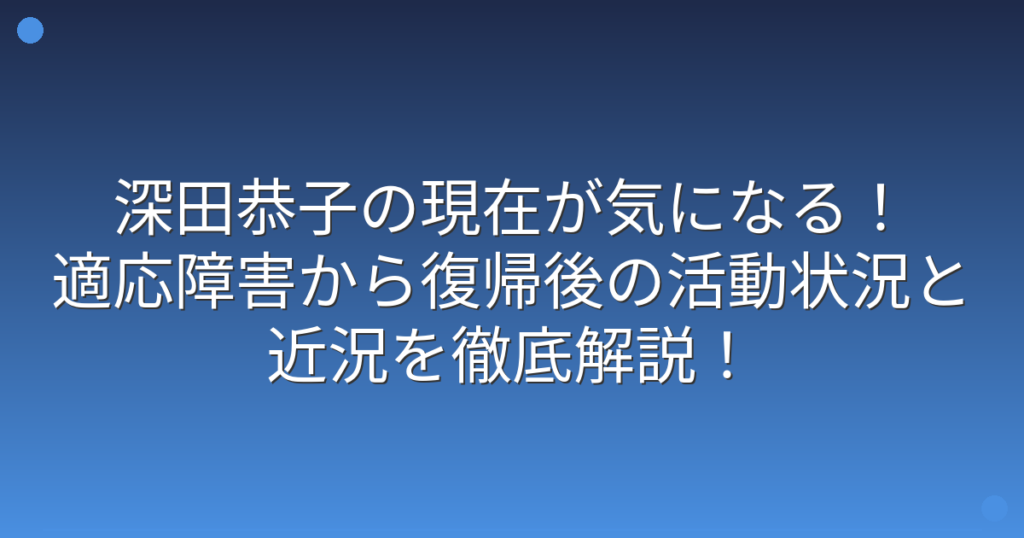 深田恭子さんの現在の様子が、ファンの間で大きな話題となっています。 適応障害からの復帰後、徐々に芸能活動を再開している深田恭子さんの近況について、多くの方が気になっているようです。 そこで今回は、深田恭子さんの現在の活動状況や様子について...